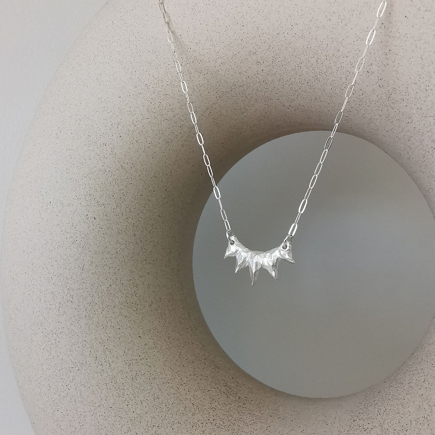 Halskjede med skinnende solstråler i rent sølv. Fra kolleksjonen "Aurora".