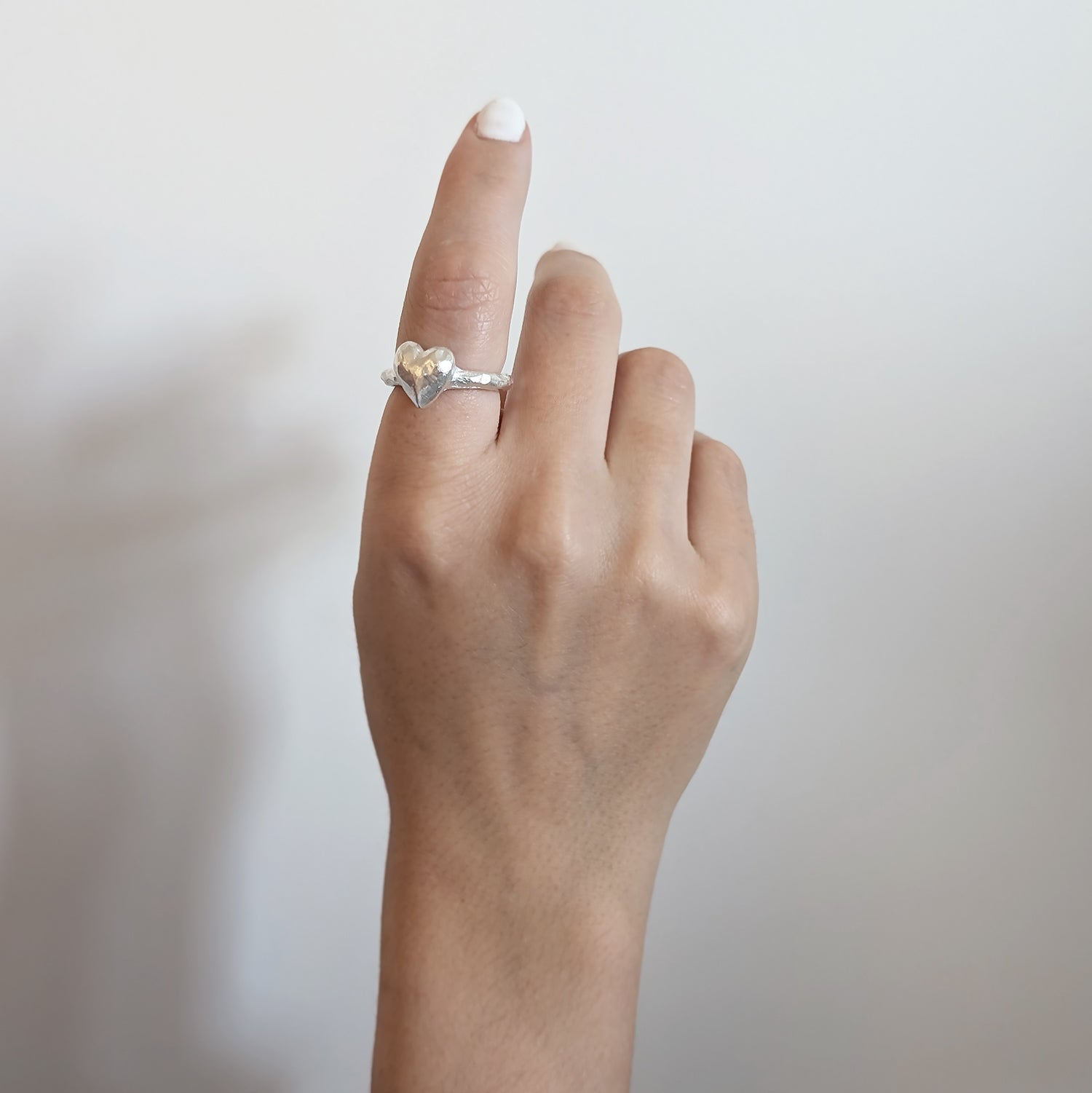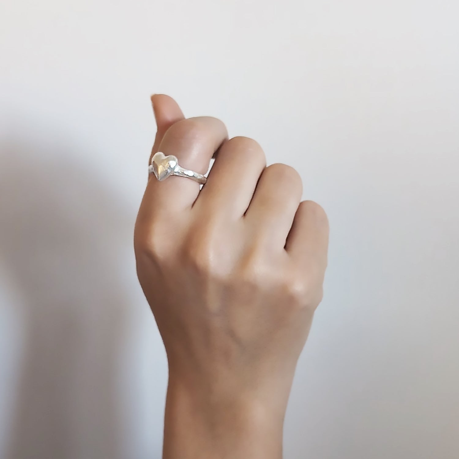 Sølvring med et stort skinnende, håndskåret hjerte. Fra kolleksjonen "Aurora".