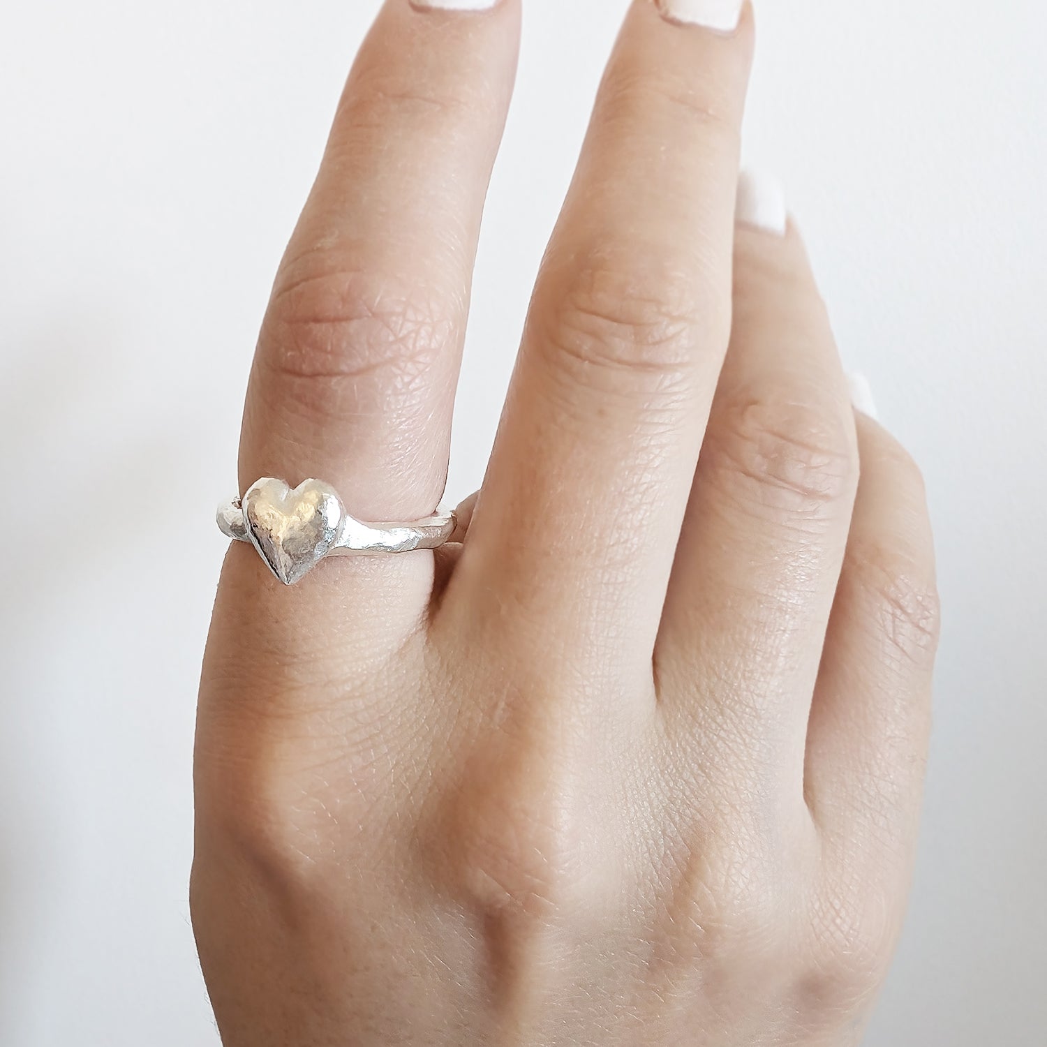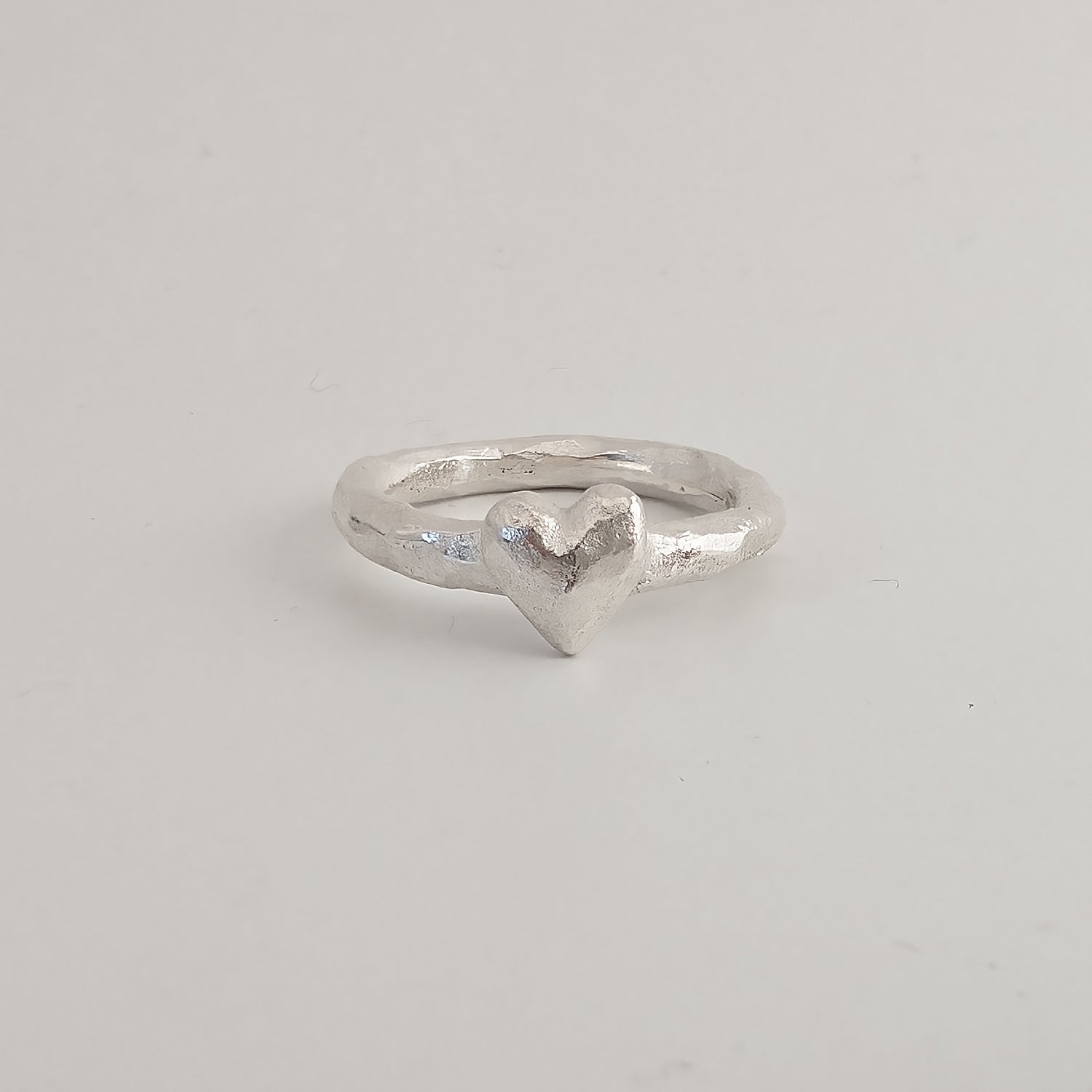 Sølvring med et medium størrelses skinnende, håndskåret hjerte. Fra kolleksjonen "Aurora".