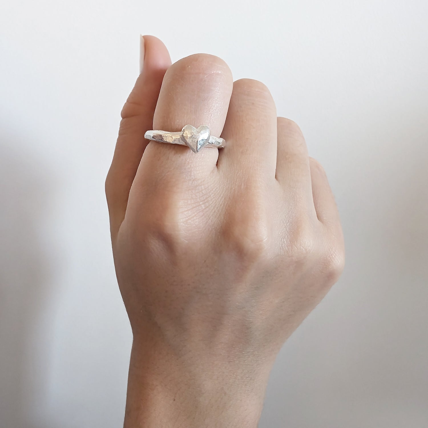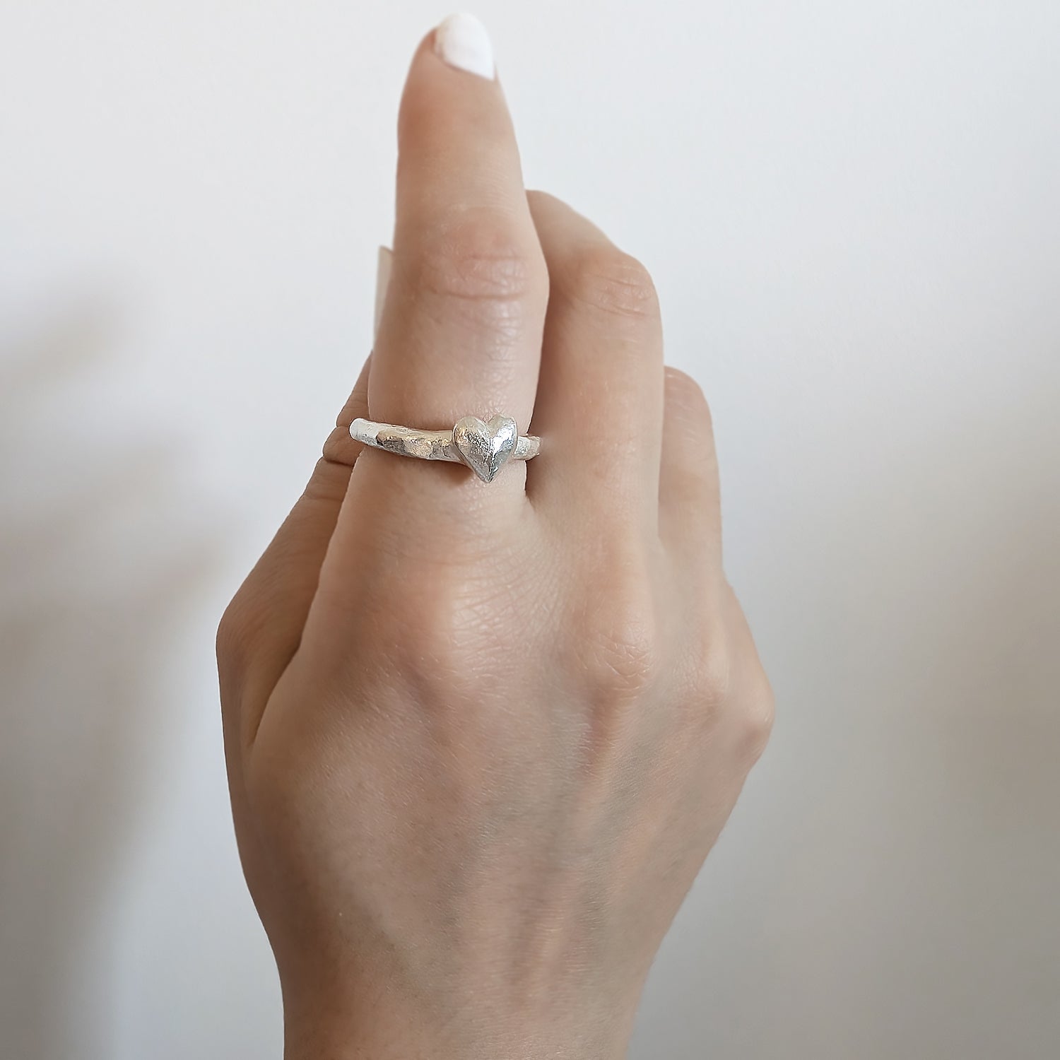 Sølvring med et lite skinnende, håndskåret hjerte. Fra kolleksjonen "Aurora".