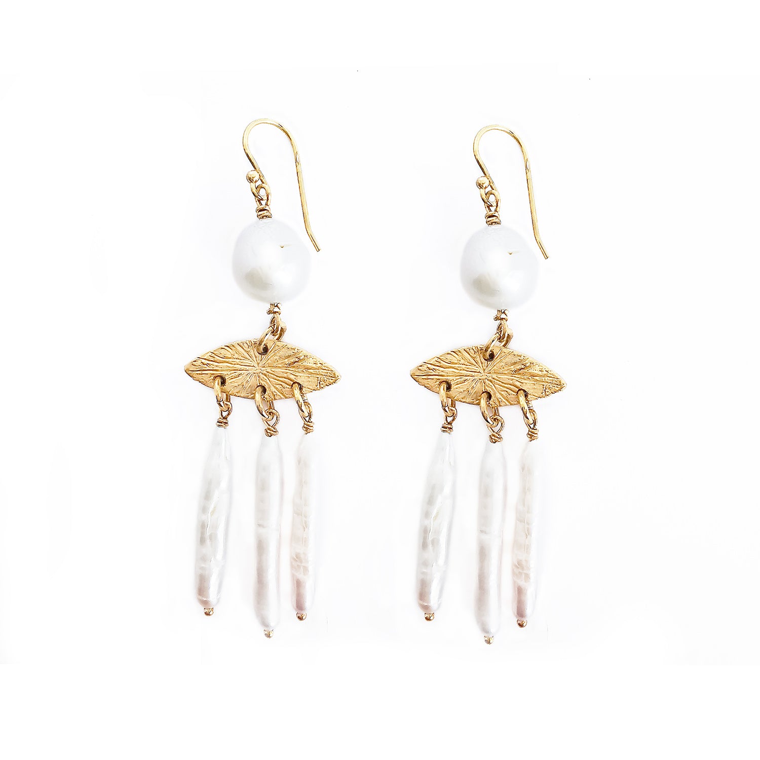 Øredobber med en barokk ferskvannsperle og dinglende avlange ferskvannsperler. Fra kolleksjonen "Aurora".