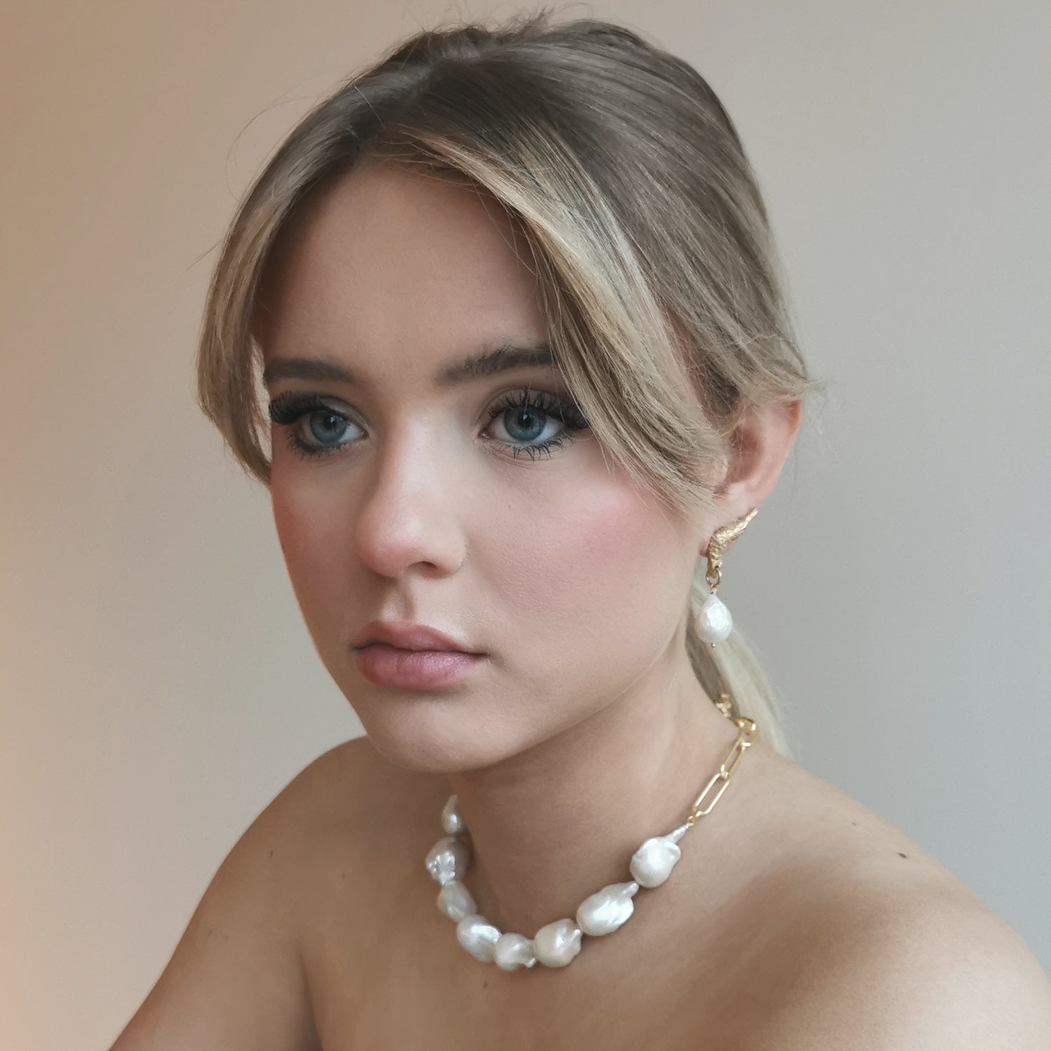 Halskjede med 8 store barokke Fireball ferskvannsperler og et kraftig 18K gullkjede. Fra kolleksjonen "Aurora".